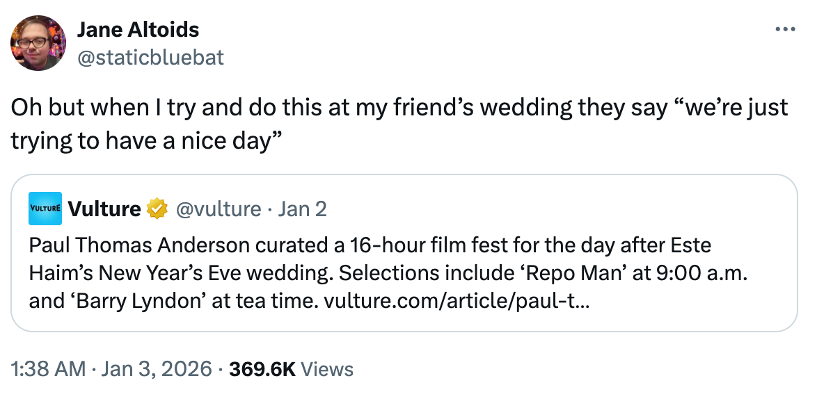 Syndicated BK: Romeo + Juliet (1996) (Dates: 2.14-2.15) — My (other) Valentine’s Day pick for New Yorkers! Catch Baz Luhrmann’s stylized adaptation of the Bard’s doomed romance at Bushwick’s best (and possibly only?) dine-in theater. Romeo + Juliet (1996) stars Leonardo DiCaprio and Claire Danes as the titular characters, reimagining fair Verona as Verona Beach. In 2021, critic Stephanie Zacharek revisited the maximalist mid-90s time capsule for its 25th anniversary, writing: “Luhrmann’s film is a dizzying assemblage of fast cutting and mad camera swirls; scenes sometimes chop off abruptly, leaving you reaching out, longing for more — but even that is part of the movie’s brash, prismatic lyricism.”